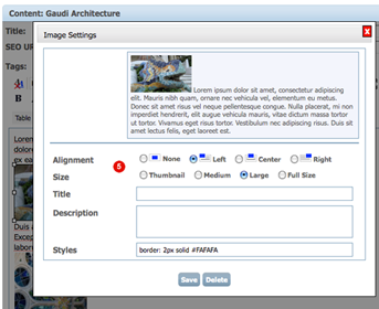 5. Image Settings Pop-up: Clicking on the image in the WYSIWYG will bring up the "Image Settings Menu" that allows you to set Image Alignment, Size, Title and Descriptions, and even enter CSS Style.