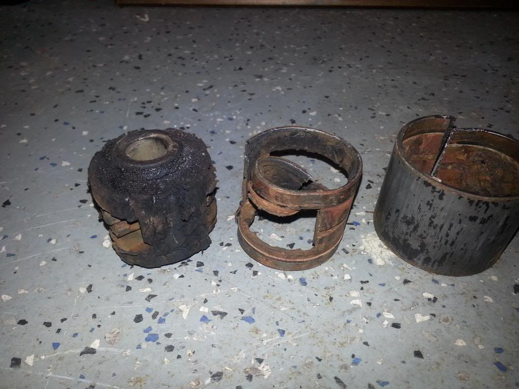 Next, the modifications for the front bushing location. As seen in the following photo a tiny bit of the metal sleeve needs to be ground down or cut off and all but about 3/16" of the outer lip of each of the bushing pieces.