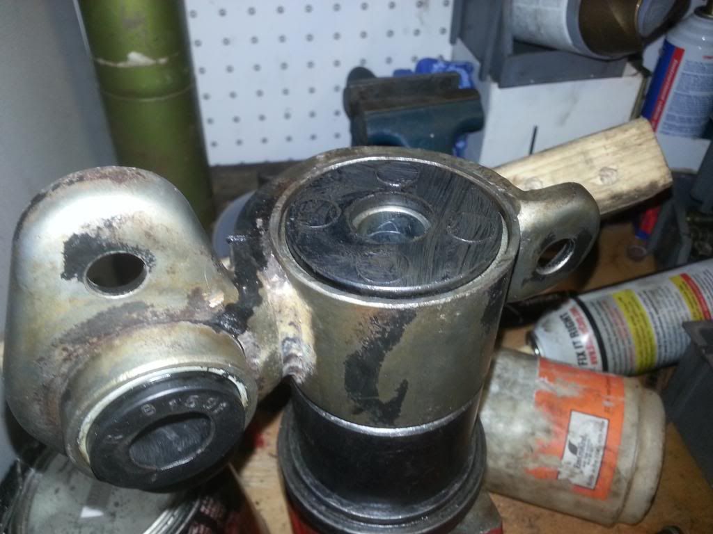 Now for the Front Control arm bushings, To get them out I sprayed some pb blaster around them on the edges then hit them with a large ball peen hammer to knock them out. It only took a few good blows to knock them out.
