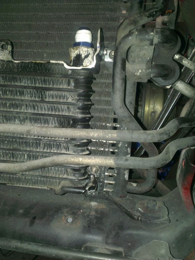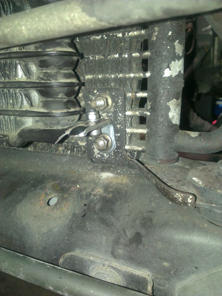 Next I modified the mounting points on the oil cooler just slightly in order to able to attach 90° brackets to the AC condenser bolts.