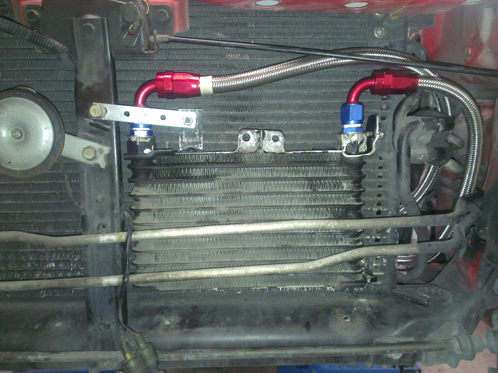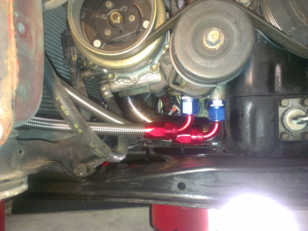 AN fittings by the oil filter. The guides I read regarding relocation of the oil cooler mentioned that the cross member below the oil filter would have to be removed in order to access these fittings but I found that it wasn't necessary at all.