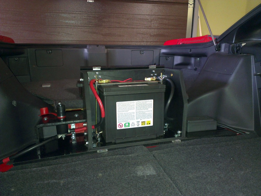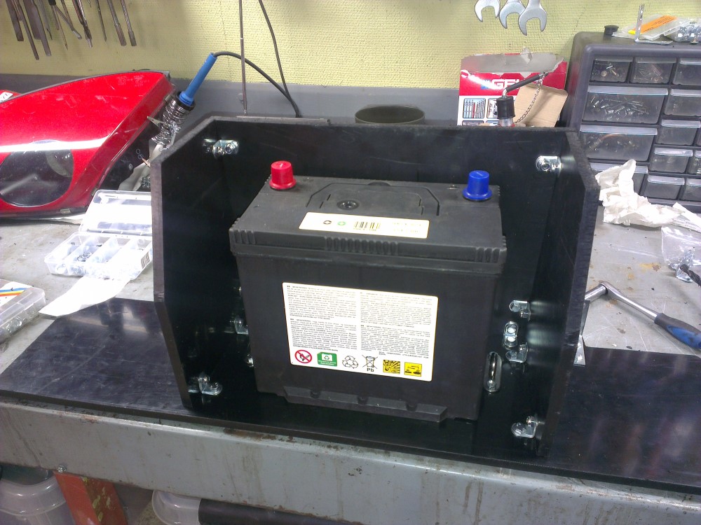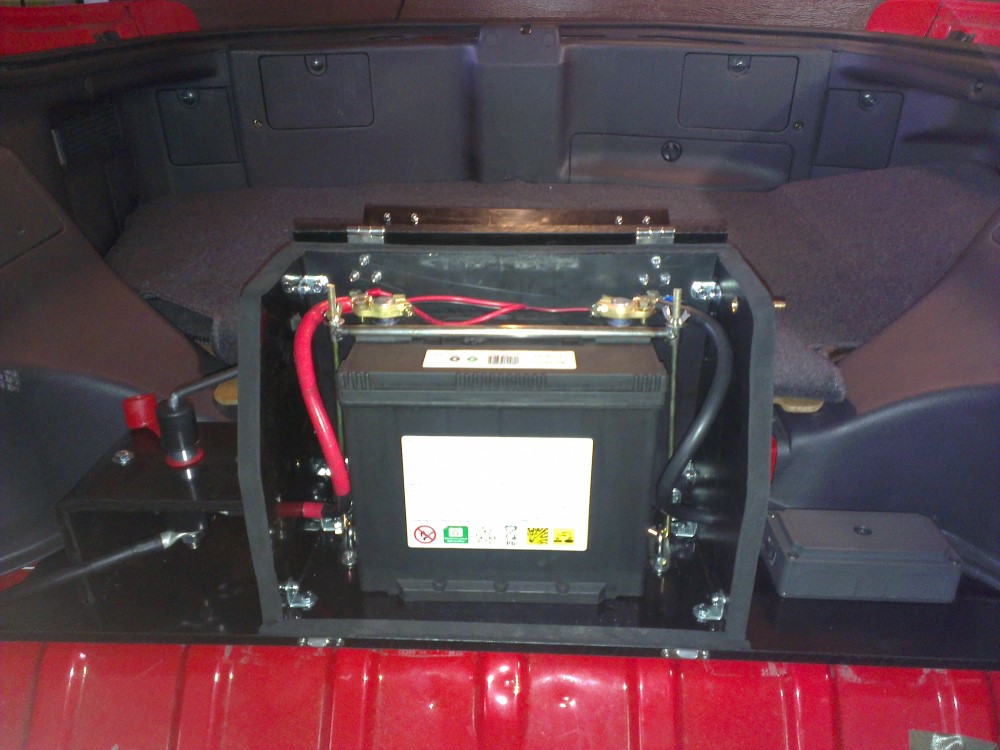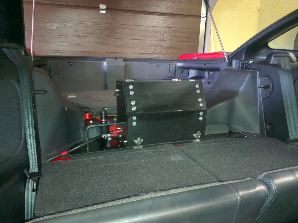 Since I enjoy going to various track days during the summer months I knew that the battery would have to be in a sealed enclosure if I wanted to have inside of the car. I spent days looking for a suitable sealed battery box that would fit behind the rear seats but all boxes I found were to big to fit properly.