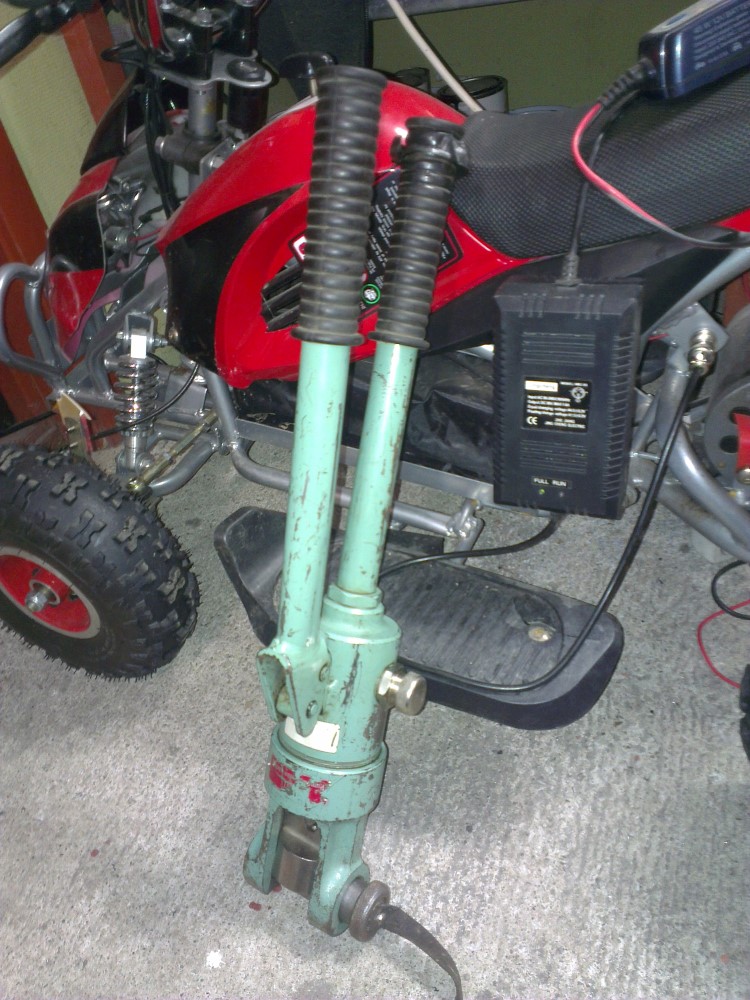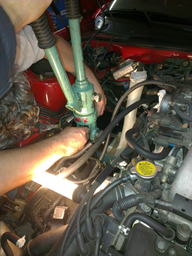 In order to join the new 50 mm2 cable (similar in size to 0 gauge) running from the back of the car to the old cable engine bay I enlisted a friend of mine who is an electrician. He brought over a massive tool for crimping cables of this size. The tool was hydraulically actuated and it took considerable force to crimp the cables.