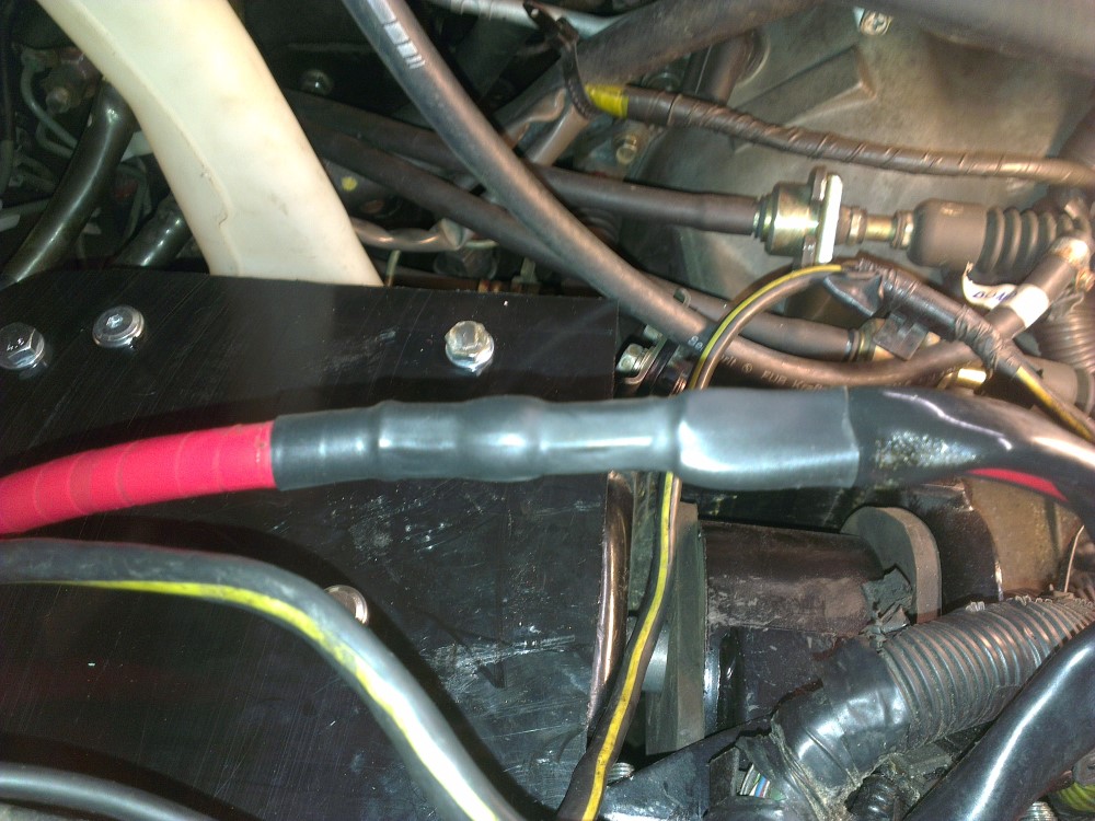 This is where I connected the ground cable. I first grinded away the paint on both sides of the belt bracket and then the car itself to ensure a good connection.