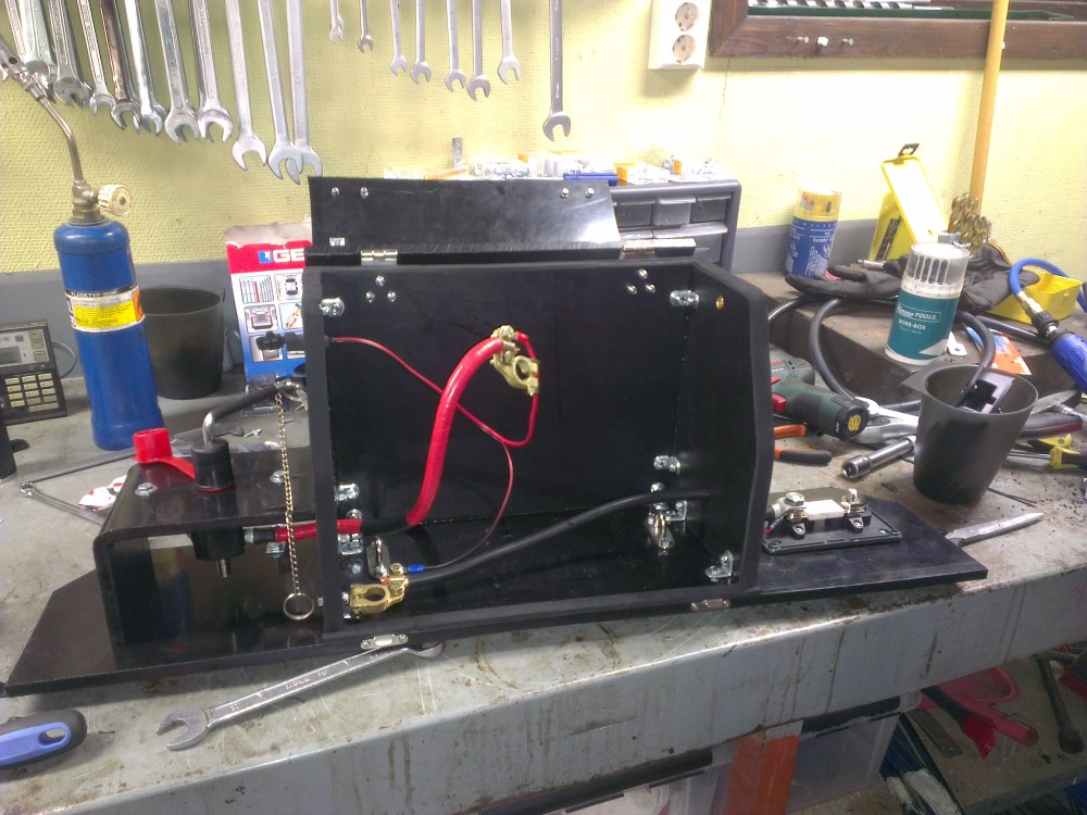 The box slowly coming together piece by piece. On the left I added a cutoff switch rated at 250 amps continuous 2500 amps peak. On the right I added a fuse holder just to be on the safe side.