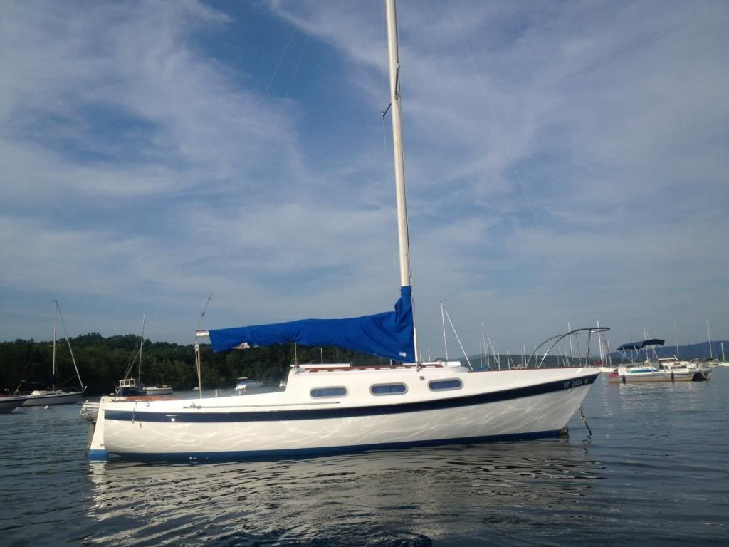 I bought this boat from my old boss. It is a 1972 Tanzer. I really didn't know anything about boats, let alone sailing; but I've always thought it would be cool to try it. Just about everything cosmetically that could be wrong with a boat... was wrong with this boatIt was probalby the biggest eye sore on the water. The only things I really liked about it were that it floated, came with a trailer, had a collasable centerboard, and had good sails. Here is a shot of me sailing it on Lake Champlain. I had my friend with me who knows how to sail. I need practice.