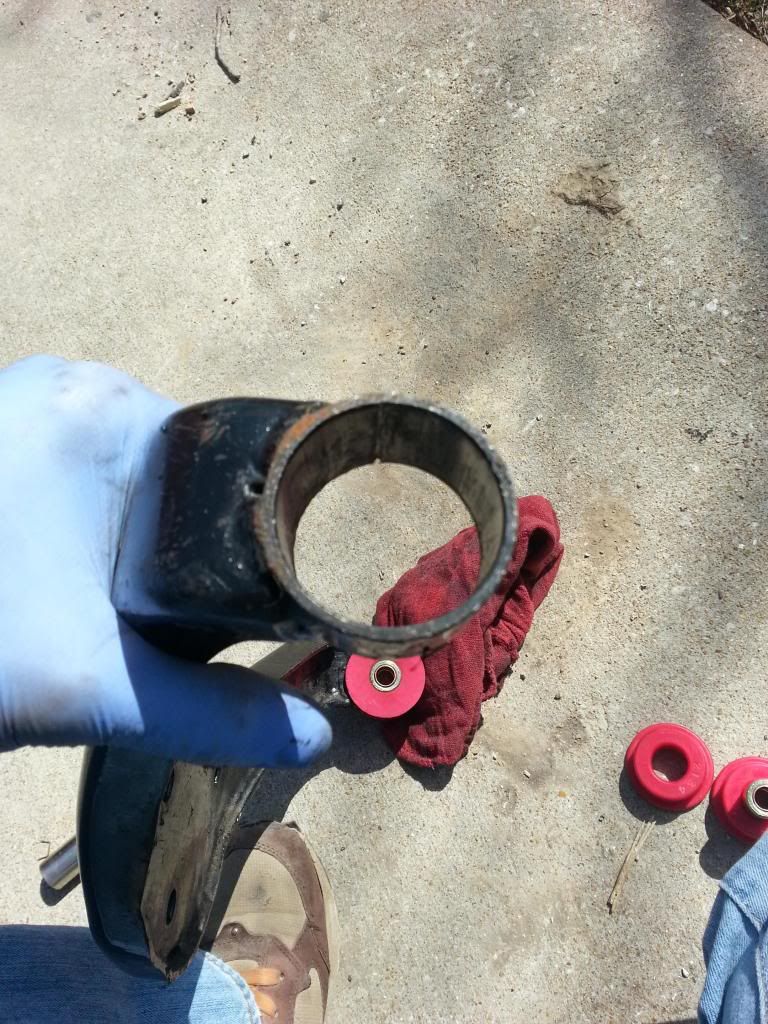 From here the bushings should slide easily into the mount holes. There is a gap between the 2 bushings, but I just fill it with grease and also grease the bushing prior to instillation too.