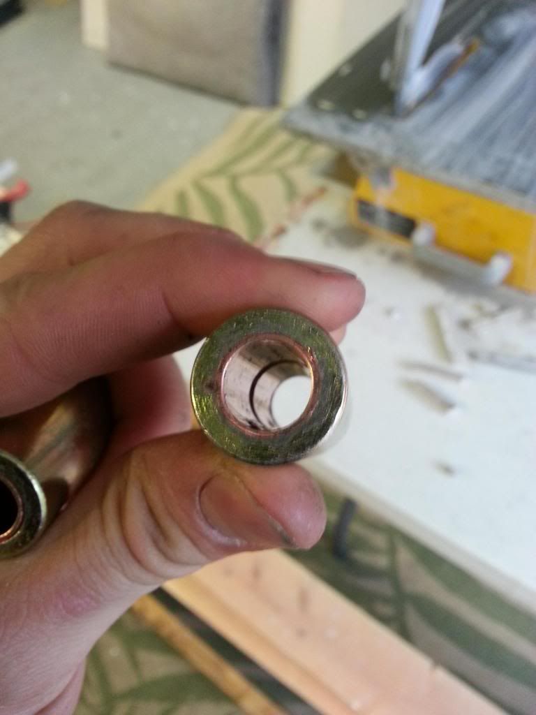 The only problem is the inner diameter on the pins is 9/16" but our bolt is about 3/8" To fix this gap I found some copper pipe couplings (2 per bushing so we need 8 total) at Home Depot at 79 cents each.