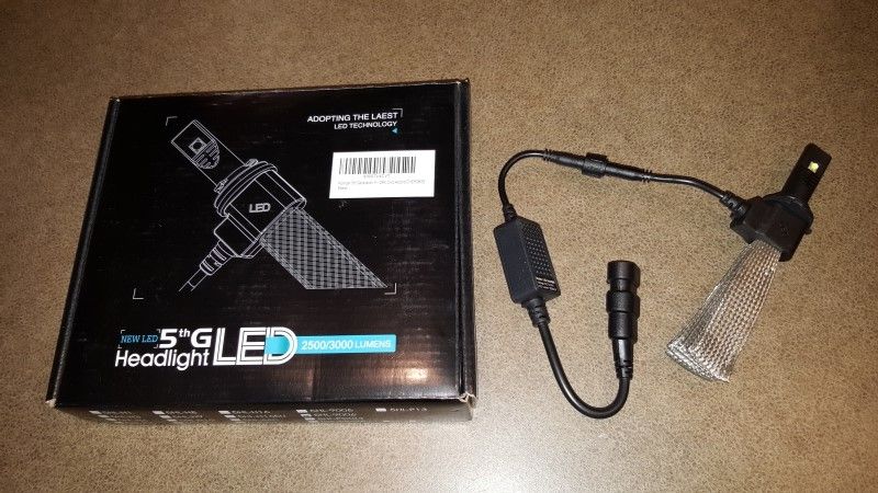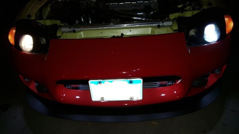 Up front I got my FMIC lights and LED fog lights separated so that the LED fog lights work with the factory fog light switch and the FMIC lights are wired up to a remote control unit. I also bought a $47 low beam LED headlight kit to try out. I replaced the driver's side bulb with the LED bulb. The passenger side headlight has a halogen bulb left in it for comparison. I've been fighting a high idle issue so when the car is road worthy again I will test out the LED bulbs to see if the light output is good or not. Just looking at how they shine on the front of the garage wall 7 feet in front of them the LED bulb has a much crisper cutoff and the light is truly white to match the rest of the LED lighting. They have a flexible heatsink which gives enough clearance that they can be installed with the headlight still mounted in the car.